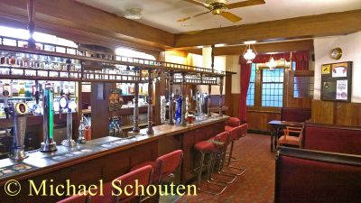 Merseyside, WHEATSHEAF, St Helens. Following re-assessment, The Wheatsheaf has been upgraded from Two to Three Stars. The Wheatsheaf is a remarkably intact example of a 1930s roadhouse in ‘Brewers Tudor’ style and was built in 1938 by the Warrington brewers Greenall Whitley. The pub retains its multi-room layout of six separate rooms with original bar counters, timber panelling, doors with etched glass panels, fixed seating, and also has a bowling green to the rear.